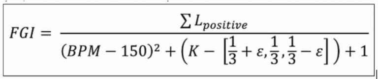 Rating = 60 + (0.00165 × BPM – 120)^2 + (4.376 × Major) + 0.78 × nChords – (Major × nChords)